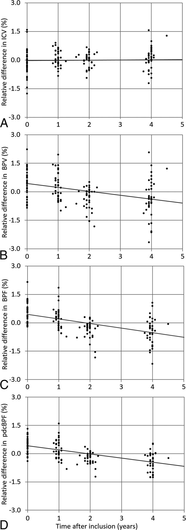 In Fig 3, the normalized ICV, BPV, and BPF are shown as a function of time after inclusion. For the separate time points, at 1, 2, and 4 years after the time of inclusion, the decrease of BPV and BPF was 2.2 mL (P = .4) and 0.37% (P < .001) after 1 year, 12.2 mL (P < .001) and 0.87% (P < .001) after 2 years, and 12.3 mL (P = .007) and 0.97% (P < .001) after 4 years. Linear regression as a function of all 4 years showed that the ICV had a nonsignificant slope of 0.02%/year (95% confidence interval, −0.03–0.08; P = .6). The BPV showed a significant decrease with time after inclusion, with a slope of −0.236%/year (95% CI, −0.372 to −0.173; P < .001). Also, the BPF showed a significant decrease with time after inclusion, with a slope of −0.273%/year (95% CI, −0.211 to −0.335; P < .001). The intercept was 0.472%.
