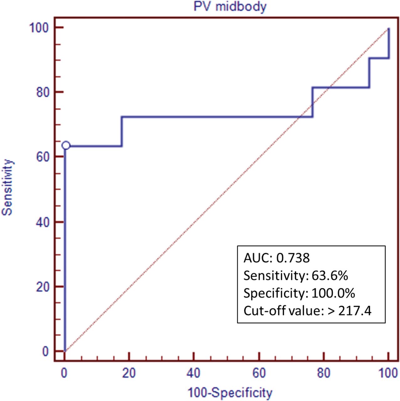 For age-specific analysis of CP prediction, patients were re-classified into 2 groups according to MR imaging before or after 1-month corrected age (Table).16,17 There was only 1 patient who developed CP among the 10 neonates who underwent MR imaging examinations before 1 month of age. T2 mapping had no statistically significant impact on prediction of CP in this group. Twenty-eight patients had MR imaging performed after 1-month corrected age (mean corrected age of MR imaging, 4.2 ± 2.1 months), and there were 11 patients diagnosed with CP. There was no difference in sex, gestational age, birth body weight, and birth condition between the patients with and without CP in this group. The periventricular T2-relaxometry value around the midbody of the lateral ventricles was significantly higher in patients with CP (P = .036). The area under the ROC curve for predicting CP with T2-relaxation values in the midbody periventricular white matter was 0.738 (95% CI, 0.538–0.885) with ROC analysis. The sensitivity and specificity for diagnosing CP using the optimized cutoff point of the T2 relaxometry value (>217.4) were 63.6% and 100%, respectively (Fig 4).