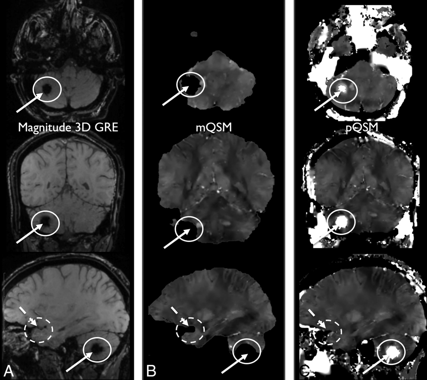 This study did not evaluate the quantitative aspects of pQSM. Although QSM is a quantitative method, current clinically used susceptibility-based neuroimaging methods are interpreted solely on a qualitative basis, assessing hypointense foci, with the occasional addition of phase maps to distinguish blood from calcification. Future work could assess the additional clinical value of mQSM/pQSM quantitative lesion analysis.