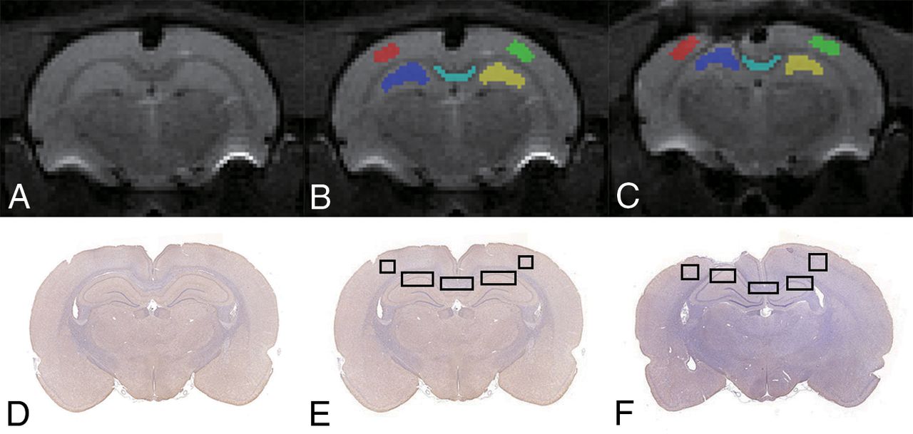 Illustration of ROIs on B0 (A–C) and histology (D–F) maps for a representative control and TBI rat. Regions shown are the bilateral cortex, bilateral hippocampus, and corpus callosum.