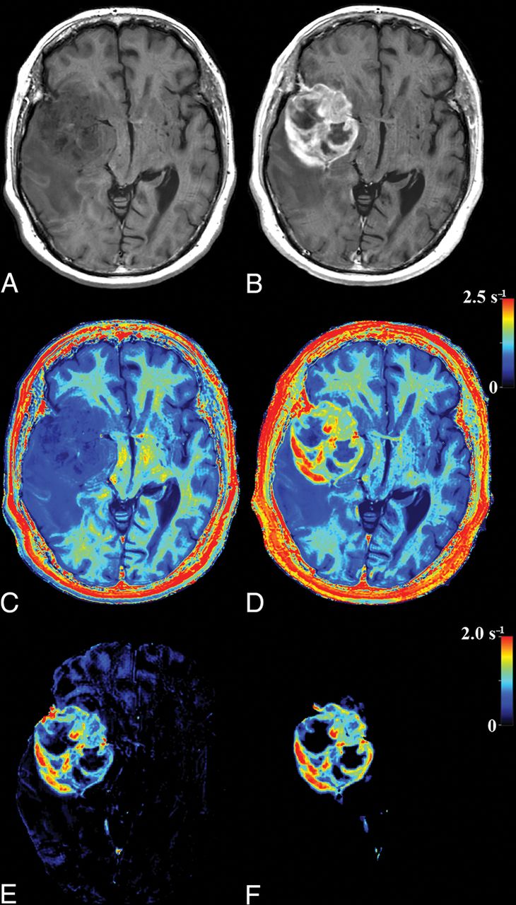 A challenge when using conventional T1-weighted images is that the signal intensity has an arbitrary scale, affected by scanner imperfections such as B1 inhomogeneity and coil sensitivity. These prohibit the use of quantitative measures of actual GBCA uptake, which is reported to add value to the assessment and prediction of the outcome of patients with high-grade gliomas.1,2 Even though contrast enhancement is an important feature when assessing high-grade gliomas, these tumors are also known to infiltrate into the peritumoral edema.3 Tumor infiltration is difficult to detect visually with conventional MR images, and quantitative measurements may therefore add information.