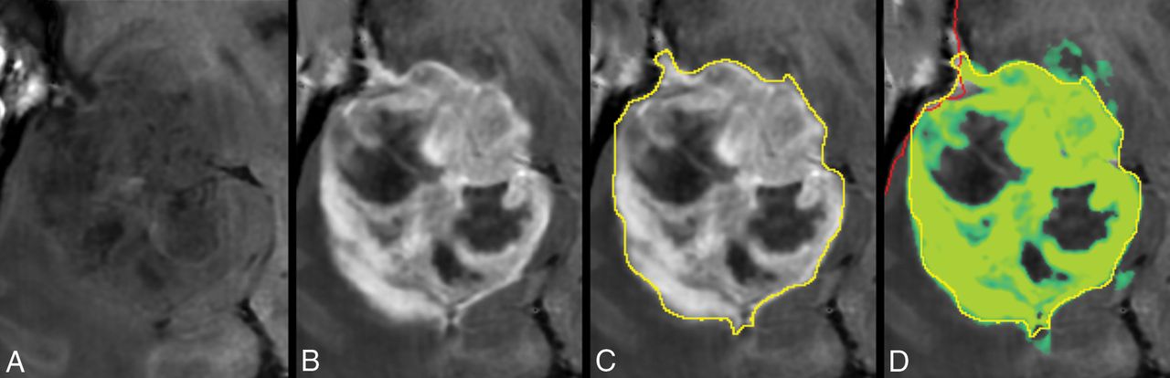 Zoomed part around the tumor displayed in Fig 2. Synthetic T1-weighted imaging using native data (A), synthetic T1-weighted imaging using post-GBCA data (B), the ROI line as drawn by a neuroradiologist to encapsulate the border of the enhancing tumor (C). D, Synthetic R1 enhancement map shown as a green overlay on the synthetic T1-weighted image in which full color corresponds to dR1 = 1.0 seconds−1. The minimum enhancement was set at dR1 = 0.2 seconds−1. Some low-intensity enhancement is visible outside the yellow ROI. The red line indicates the edge of the intracranial volume.