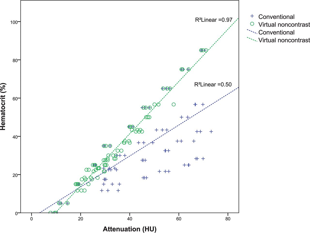 Correlation between the hematocrit level in our samples and VNC attenuation was excellent (R2 = 0.97, P < .01), while correlation with the attenuation on the conventional images was moderate, but still significant (R2 = 0.50, P < .01) (Fig 3).