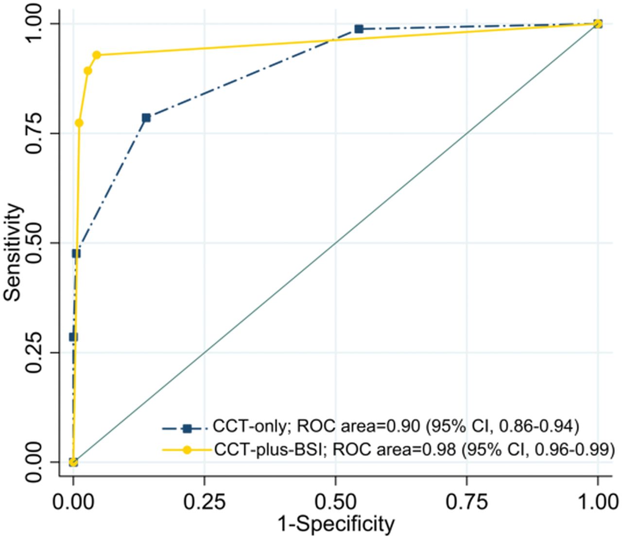 The receiver operating characteristic curves for skull base invasion and the corresponding AUCs for diagnosis based on CCT-plus-BSI and CCT-alone are shown in Fig 3. The AUC for CCT-plus-BSI was significantly larger (AUC = 0.98, P < .001) than the AUC for CCT alone (AUC = 0.90).