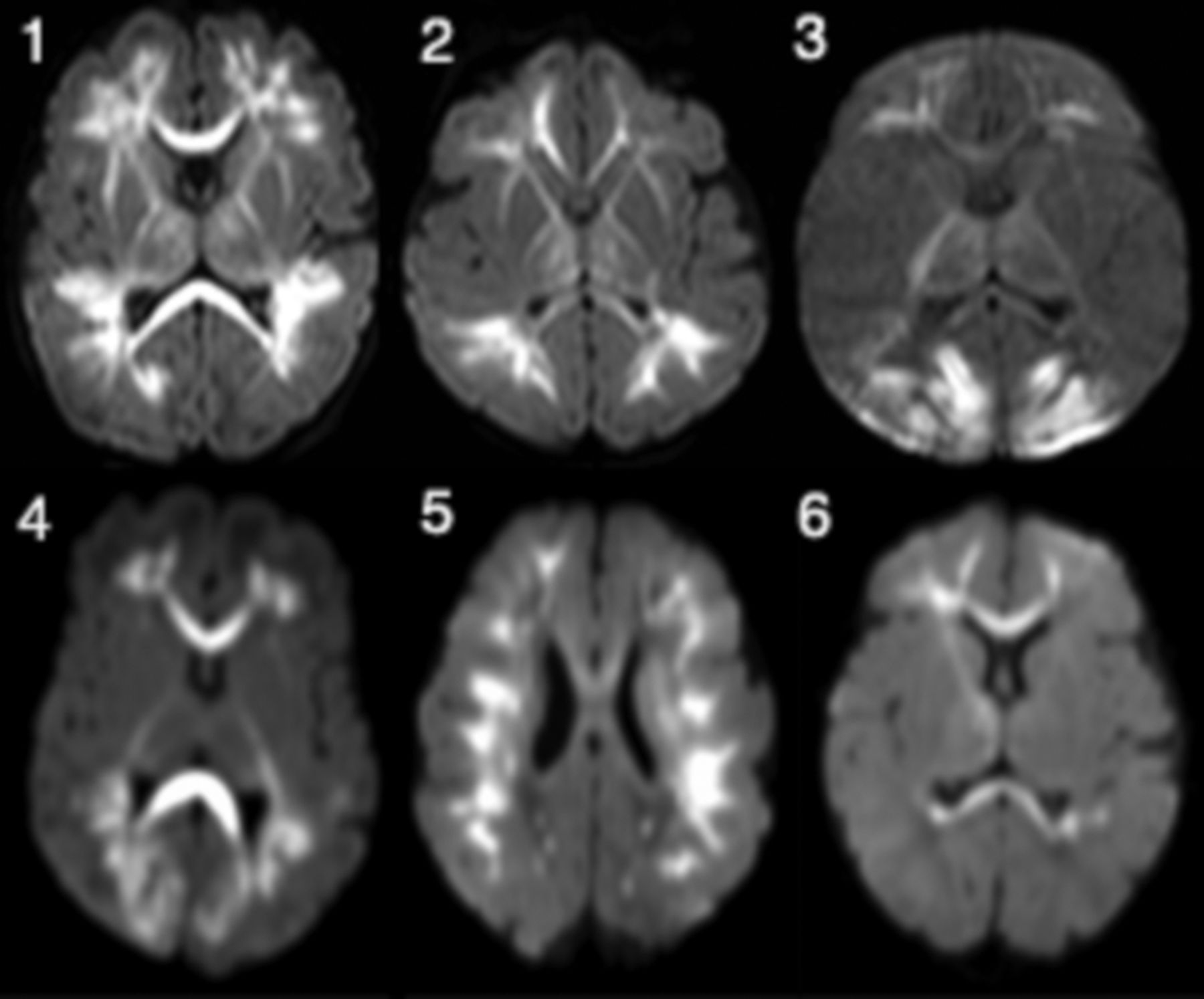 Axial diffusion-weighted images in patients 1–6 (infants with HPeV infection) demonstrate low diffusivity variably involving the periventricular white matter with frontoparietal predominance and also involving the corpus callosum, thalami, and internal and external capsules. Patients 3 and 4 exhibit greater involvement of the occipital white matter and the occipital cortex. Patient 5 shows more confluent involvement of the subcortical white matter.