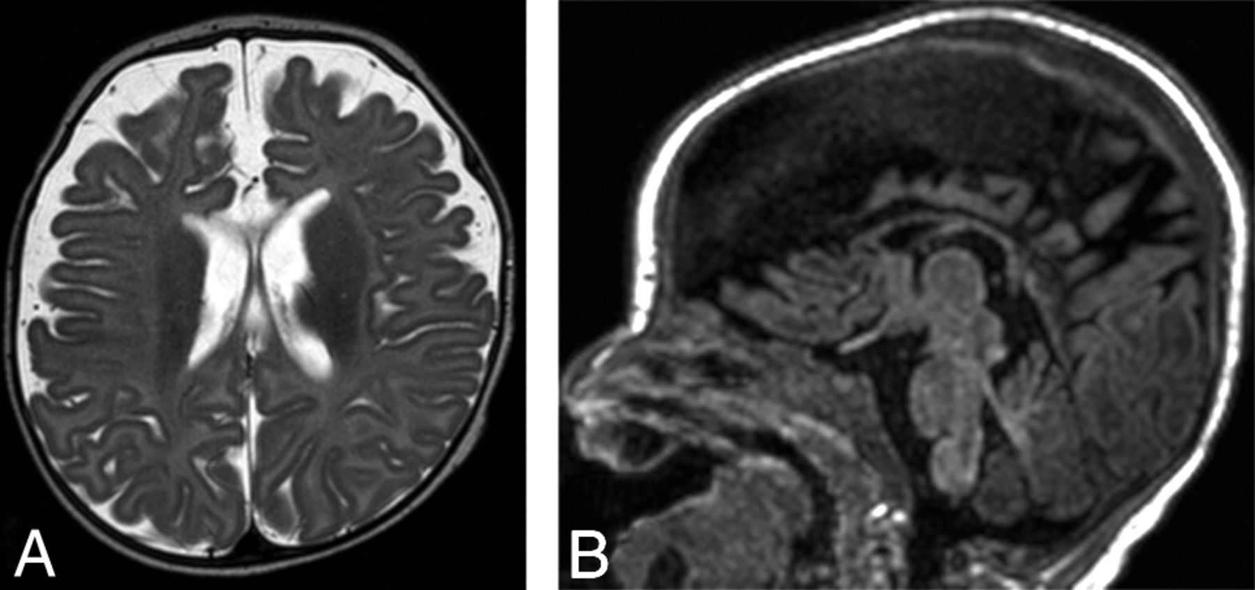 Axial T2-weighted image (A) and sagittal T1-weighted image (B) obtained in patient 1 approximately 3 months after acute HPeV infection show new diffuse enlargement of the extra-axial spaces and thinning of the corpus callosum, suggesting volume loss.