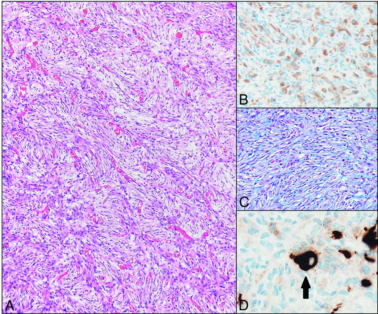 Hematoxylin eosin–stained photomicrograph demonstrates the characteristic fascicular/storiform arrangement of the prominent spindle-shaped glial component of the tumor (A, scaled from 100×). These cells are glial fibrillary acid protein positive (confirming their glial origin) (B, scaled from 200×), and an abundant pericellular connective tissue network is highlighted by the methyl blue component of a Mason trichrome stain (C, scaled from 100×). Rare ganglion cells are present (arrow), which are highlighted by Synaptophysin immunostaining (D, scaled from 400×).