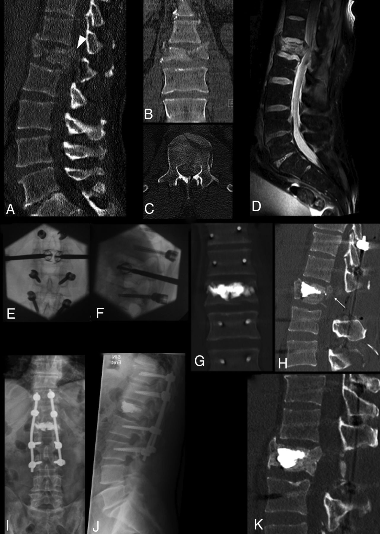 Complete burst fracture of L1 following high-energy trauma in a 40-year-old man with marked vertebral body fragmentation (A–C) and posterior wall retropulsion (arrowhead, A). Sagittal fat-saturated proton density MR image (D) shows an epidural hematoma and compression of the conus medullaris, but the patient was neurologically intact. The patient underwent surgical treatment in a hybrid operation room, including, in sequence, L1 decompressive laminectomy, pedicular screw placement, fracture reduction and vertebral body augmentation with percutaneous bilateral SpineJack, and posterior stabilization with spinal rods (E and F). Postprocedural CT (G and H) shows fracture and kyphosis reduction and, most important, central canal clearance (arrow, H) through ligamentotaxis. Notably, no maneuvers of direct fragment impaction or of posterior fracture distraction were performed. Follow-up imaging with standing plain films at 6 months (I and J) and with CT at 12 months (K) shows preserved vertebral body height and alignment and osseous healing around the cement cast. In this case, a more invasive procedure of corpectomy and anterior column stabilization could be successfully avoided by armed kyphoplasty.