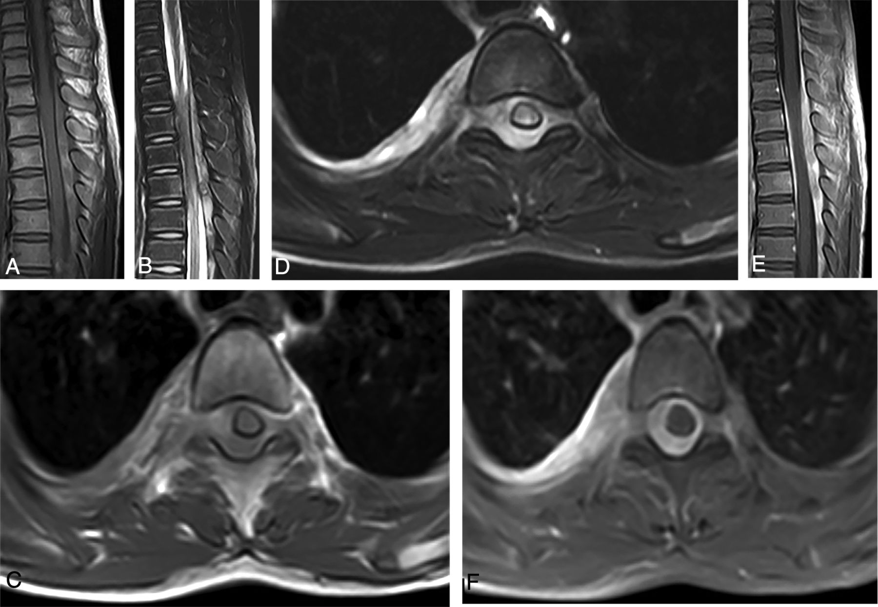 MR imaging of intraspinal paragonimiasis in a 6-year-old patient. Sagittal T1WI (A) and T2WI (B) show a longitudinal fusiform-shaped mass located in the intraspinal extradural space parallel to the level of T2–T11, with predominant isointensity on T1WI and hyperintensity on T2WI, and there are multiple patchlike hemorrhagic areas with hyperintensity on T1WI and hypointensity on T2WI within the mass. Axial T1WI (C) and T2WI (D) show that the mass is located in the extradural space and extends to the right intervertebral foramen, connecting to the irregularly thickened pleural lesions on the right, accompanied by a small amount of pleural effusion. The compressed spinal cord moves slightly to the left front, and there is edema with hyperintensity on T2WI. The sagittal (E) and axial (F) views of the contrast-enhanced images indicate that the mass is obviously enhanced, and there are scattered nonenhancement areas within it. Additionally, the adjacent spinal meninges show obvious enhancement.