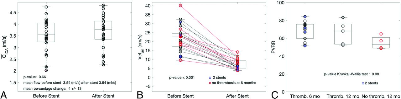 Second, poststent MR imaging measurements were performed shortly after the procedure and did not reflect the entire IA thrombosis evolution influencing both the flow conditions and the neck endothelialization as shown in vitro by Gester et al.40 Consequently, our statements should be weighed carefully, and further studies should be considered to monitor aneurysmal velocity modification during follow-up imaging. Third, our results presented here (based on systolic velocity reduction) are limited among other relevant flow parameters in flow diversion, such as wall shear stress, the stagnation zone, and residence time. The inherent limitations of the PCMR technique (spatial and temporal resolution) must be considered to accurately resolve near-wall velocities and low velocity ranges. Further research is needed to improve PCMR measurements to allow a reliable computation of these hemodynamic parameters. Finally, the small number of patients, especially for 12-month thrombosis time and thrombosis absence, may have limited the emergence of a significant relationship between PVRR and thrombosis time. The inaccuracy of low-velocity measurements could have also affected the low PVRRs. A study with a larger sample size would help in confirming the PVRR as a potential predictor for fast and delayed thrombosis.