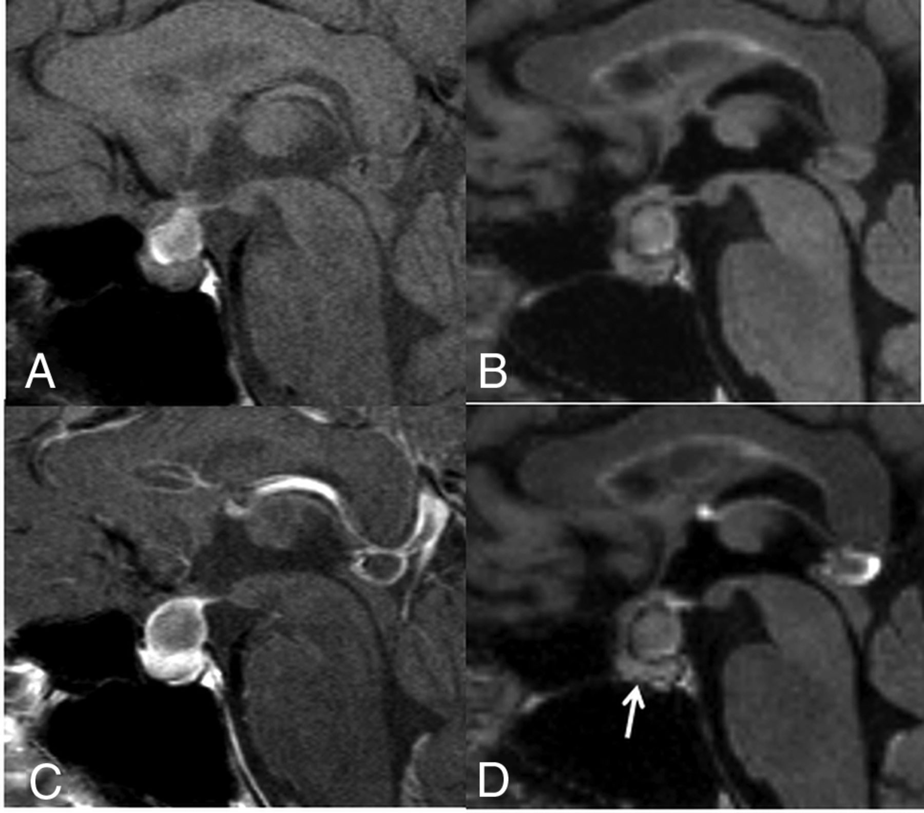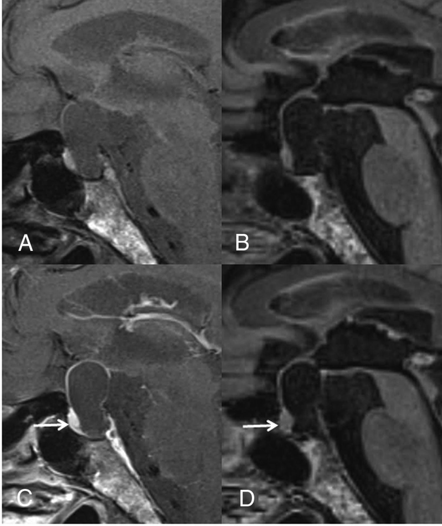 A 40-year-old woman with an RCC. On the postcontrast T1WI (C) compared with the precontrast T1WI (A), the cyst wall is enhanced (grade 2), as is the pituitary gland. Unlike the precontrast 3D T2-FLAIR image (B), the postcontrast image (D) shows no contrast enhancement (grade 0). Different from the postcontrast T1WI (C), the pituitary gland is not enhanced on the postcontrast 3D T2-FLAIR image (arrow in D). The observer judged this lesion as equivocal (scale 3) at the conventional MR interpretation, whereas the confidence level was changed to probably an RCC (scale 2) by the addition of 3D T2-FLAIR interpretation.