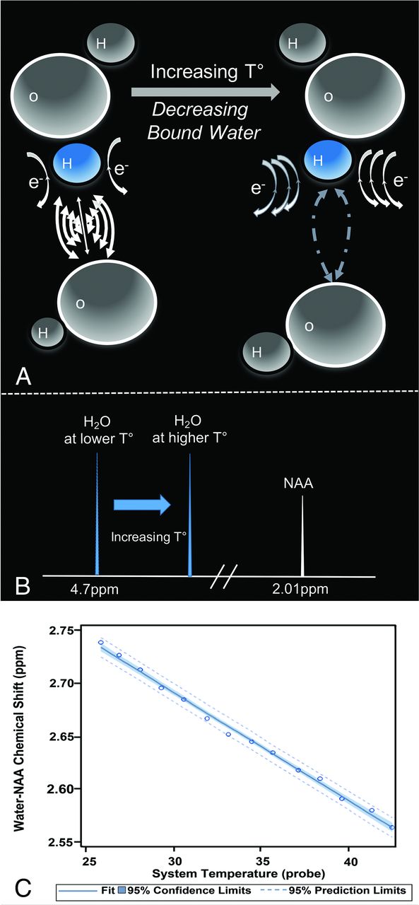 A, Schematic representation of the temperature-dependency of the water proton resonance frequency chemical shift. A water hydrogen bonding scenario for water molecules in two milieu of differing temperatures is depicted. Increasing temperatures drive the water hydrogen bonding equilibrium towards greater free water proportions through disruption of hydrogen bonds. Electronic currents (“e-”) about the hydrogen proton shield it from the main magnetic flux, but will vary in strength between strongly (left) and weakly (right) bound water pools. The greater shielding of free water hydrogens (right) yields lower precessional frequencies, governed by the gyromagnetic ratio of hydrogen, ∼42MHz/T. B, Within the hydrogen PRF spectrum, higher temperatures translate the water resonance upfield (i.e. towards lower chemical shifts), reducing the chemical shift difference between water and a non-temperature dependent reference such as the methyl resonance of NAA, producing a linear correlation coefficient (C) of ∼−0.01 ppm/C. As shown, the relationship between hydrogen bonding equilibrium, PRF, and temperature remains linear across even supraphysiologic temperature ranges as demonstrated in an aqueous cytosolic phantom during real time fiberoptic temperature monitoring. Adapted from Dehkharghani et al.76