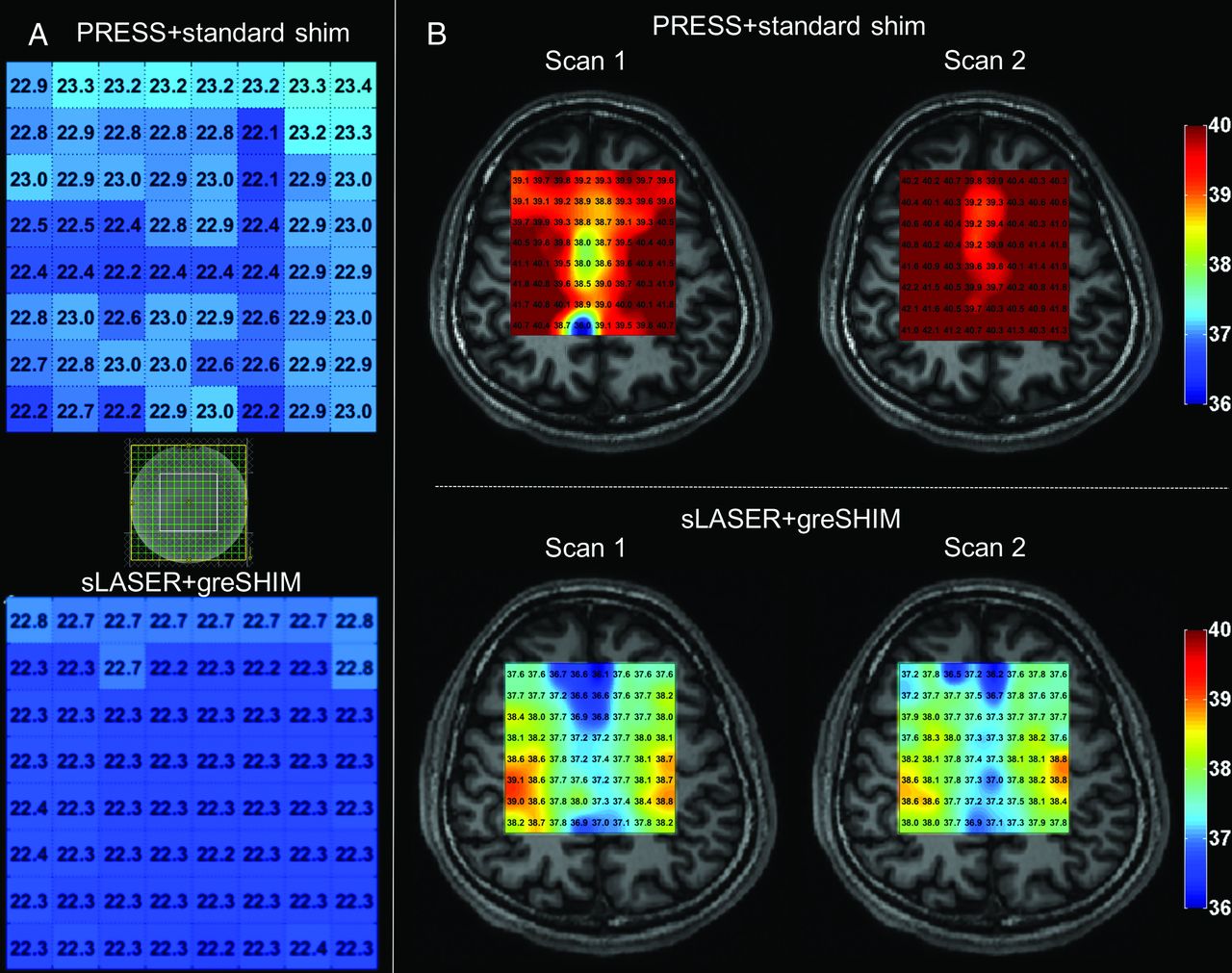 Phantom (A) and human in vivo PRF thermometry in a healthy volunteer (B) using the water-NAA chemical shift, demonstrating the impact of adiabatic (semiLASER) versus conventional volume localization (PRESS) and improvements in the shimming conditions using 3D gradient-echo (greSHIM). Spatially uniform phantom temperatures are noted in A with improvements in SNR, fitted line widths, and test-retest repeatability (not shown) by comparison with conventional point-resolved spectroscopy using sLASER at 3T. Greater test-retest stability obtained 30 minutes apart and the presence of physiologically meaningful temperature gradients are demonstrated to greater advantage in the lower row of B when using sLASER for spatial localization together with greSHIM. Adapted from Dehkharghani et al.,86,88 with permission from the International Society of Magnetic Resonance in Medicine.