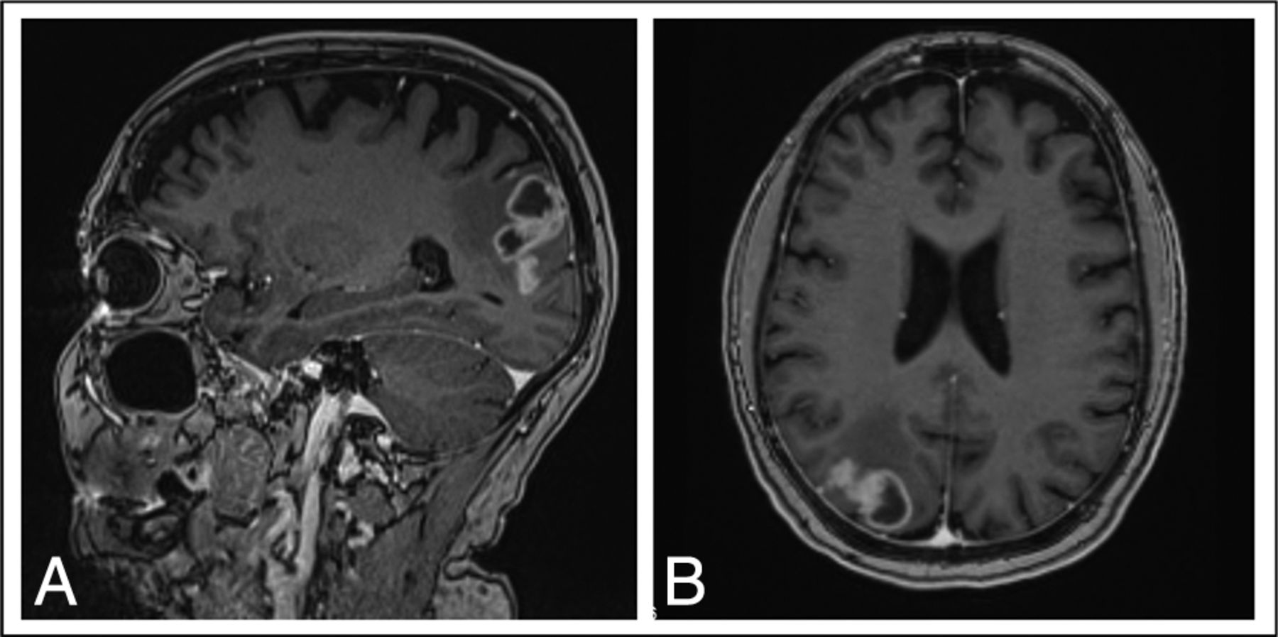 Brain MR imaging for patient 1, a 67-year-old woman with locally advanced EGFRm NSCLC. Sagital (A) and axial (B) projections show enhancement along the parenchyma, with ring-enhancing lesions extending into the right parietal sulci in continuity. The scan was performed for restaging purposes, before any brain-directed treatment.