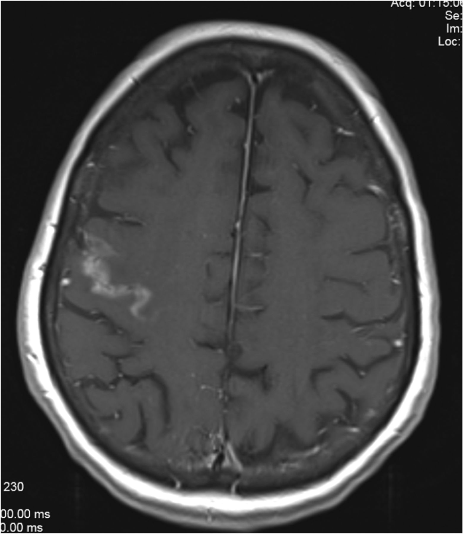 Brain MR imaging for patient 3, a 49-year-old man with EGFRm NSCLC with an enhancing lesion in the left parietal lobe 14 months following WBRT.