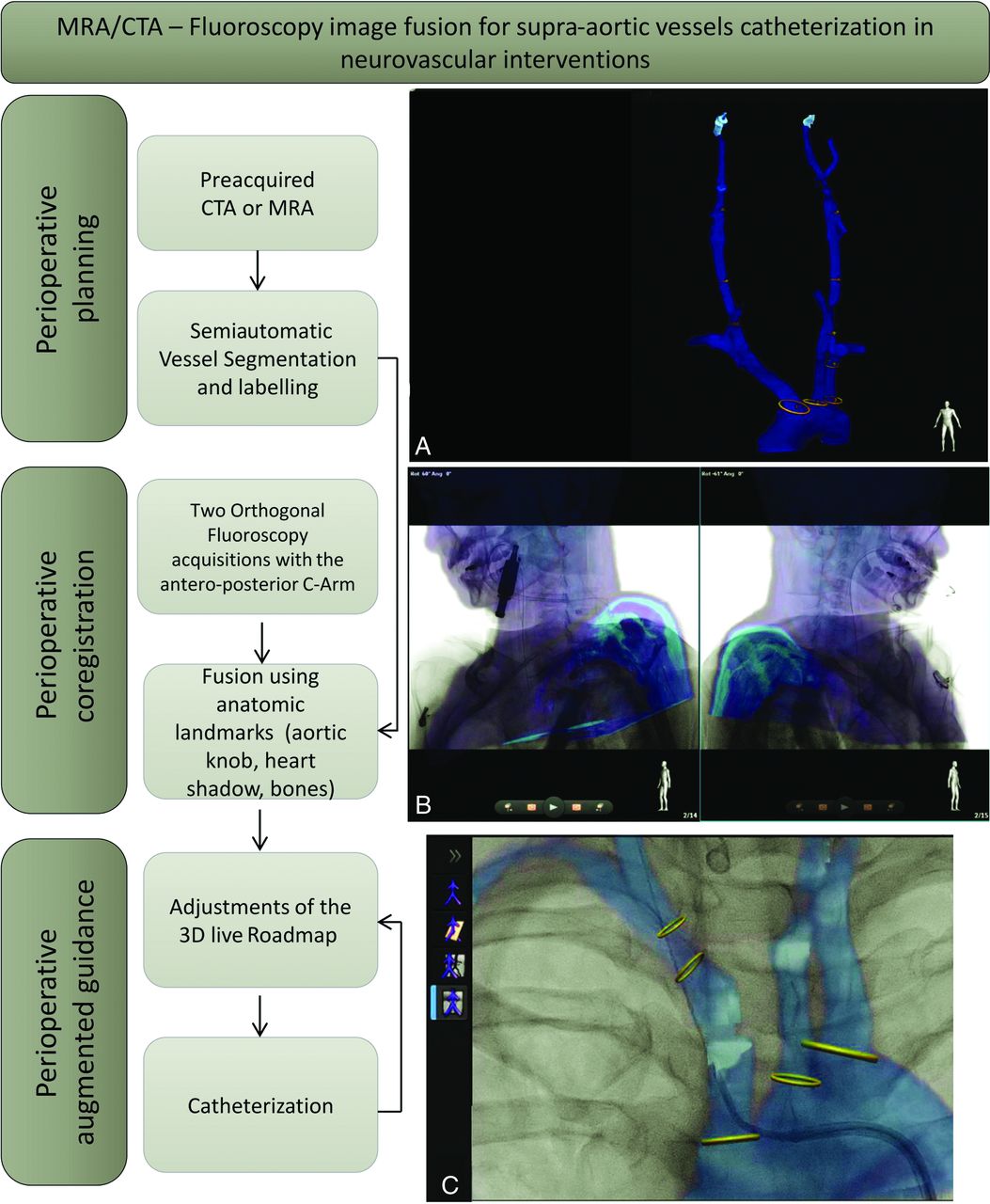 Detailed workflow of the MRA-fluoroscopy or CTA-fluoroscopy image fusion process for supra-aortic vessel catheterization in neurovascular interventions. Preoperative planning starts with uploading the MRA/CTA dataset on VesselNavigator. A, 3D semiautomatic segmentation of the aortic arch and the supra-aortic vessels and ostium labeling. B, Perioperative 2D–3D coregistration with 2 orthogonal positions of the anterior-posterior C-arm using anatomic landmarks. C, Perioperative augmented guidance.