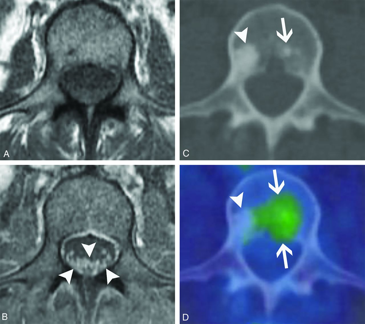 POEMS syndrome. A 50-year-old woman presented with weakness, burning, and tingling in her extremities that had waxed and waned over 4 years. Axial T1-weighted pre- (A) and postcontrast (B) images from her lumbar spine MR imaging show diffuse enlargement and enhancement of the cauda equina nerve roots (B, arrowheads). Axial CT (C) and fused FDG-PET/CT (D) images show a non–FDG-avid lumbar vertebral sclerotic lesion (C and D, arrowheads) and an adjacent mildly FDG-avid sclerotic lesion (C and D, arrows). After additional work-up, she was diagnosed with osteosclerotic multiple myeloma, which is characterized by osteosclerotic lesions with variable FDG avidity. Her MR imaging findings were ultimately attributed to polyneuropathy in the setting of POEMS syndrome.