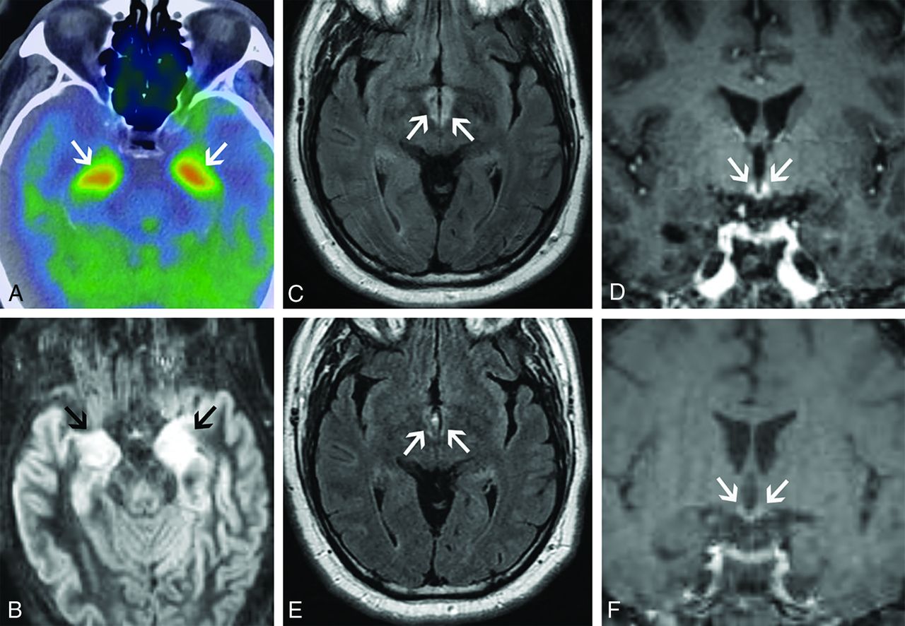 Classic limbic encephalitis (A and B). A 75-year-old healthy man presented with abrupt onset of memory loss and staring spells over several days. CSF analysis was positive for LGI1 autoantibodies. FDG-PET/CT axial image (A) shows marked hypermetabolism in the bilateral mesial temporal lobes (A, arrows). Axial double inversion recovery MR imaging image (B) shows corresponding increased T2 signal in both mesial temporal lobes (B, arrows). Atypical limbic encephalitis (C–F). A 29-year-old man with a history of resected nongerm cell testicular cancer presented months after treatment with worsening memory, diminished executive function, hypogonadism, and hypothyroidism. CSF analysis showed increased total protein but was otherwise normal. Axial FLAIR (C) and coronal T1-weighted postcontrast (D) images show abnormal T2 signal in the hypothalamus (C, arrows) and enhancement of the mammillary bodies (D, arrows). He was diagnosed with paraneoplastic limbic encephalitis with atypical involvement of the hypothalamus and mammillary bodies. He opted for observation with symptomatic improvement over months. Follow-up MR imaging shows improved mild residual hypothalamic T2 signal (E, arrows) and decreased enhancement of the mammillary bodies (F, arrows).