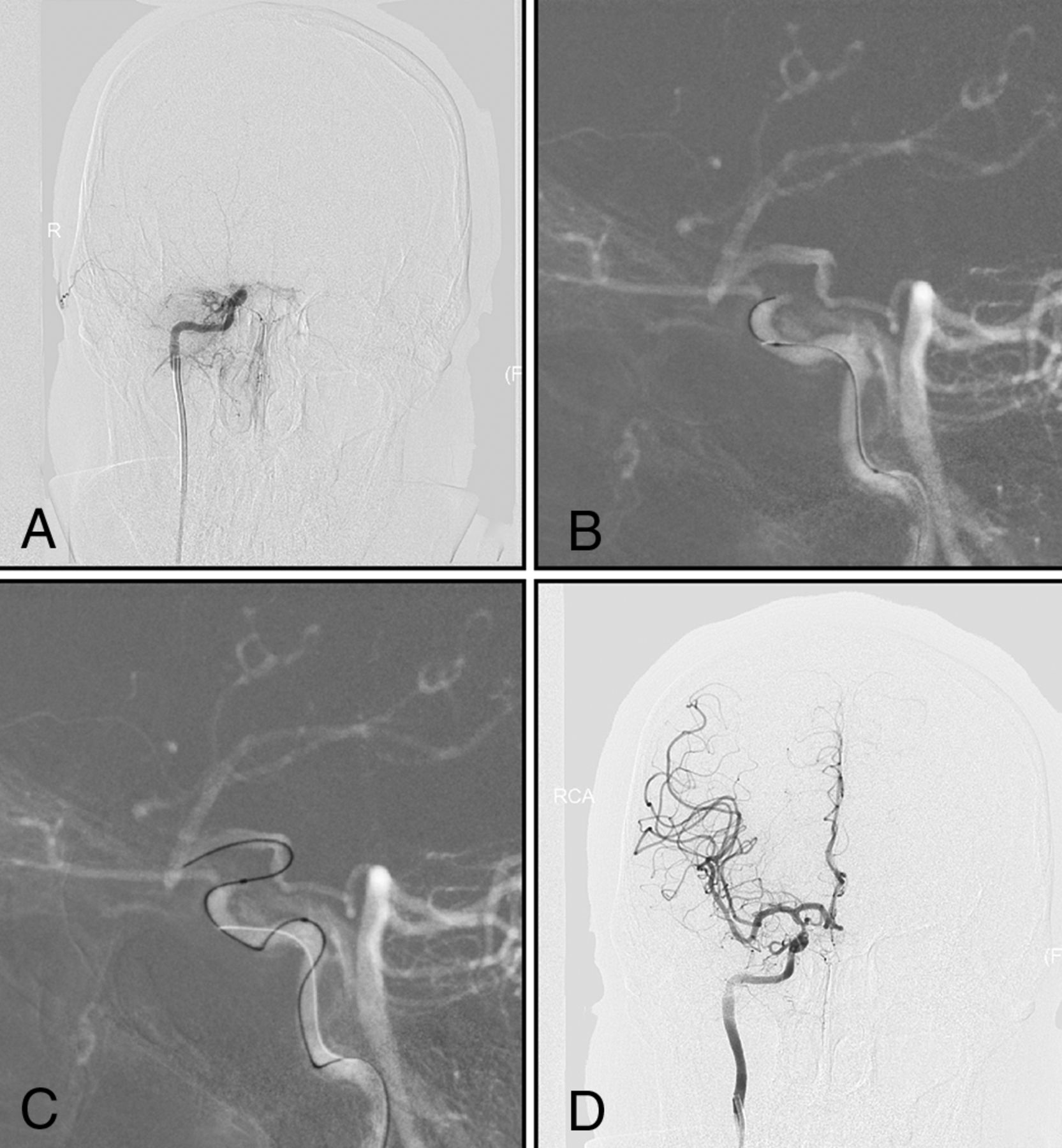 A man with left-sided weakness for 20 days. A and B, DSA shows that the right intracranial internal carotid artery is occluded, with uncertain occlusion length and no established collateral filling to the distal right intracranial ICA via the AcomA or PcomA (type III). C, The microwire, in combination with a microcatheter, passes through the occluded segment. D, Successful recanalization.