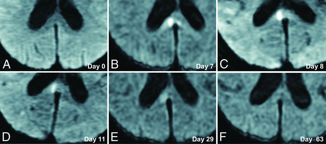 A 70-year-old woman presented with poor-grade SAH (Hunt and Hess grade 4). CT revealed Fisher group 3 SAH, and MRA demonstrated a 5-mm-diameter aneurysm on the anterior communicating artery. The patient underwent aneurysm coiling on day 2. This patient developed DCI and received regional arterial infusion of fasudil hydrochloride hydrate 3 times. She also developed hydrocephalus and underwent ventriculoperitoneal shunting. The patient had mild disorientation and was discharged home with an mRS score of 3. Although no abnormality was evident on DWI in this patient on admission (Fig 2A), a high-signal area appeared in the splenium of the corpus callosum on SAH day 7 (Fig 2B). The lesion gradually faded and had completely resolved by day 63 (Fig 2C–F). This change was thought to represent CLOCC and was also observable on FLAIR and T2WI (Fig 3).