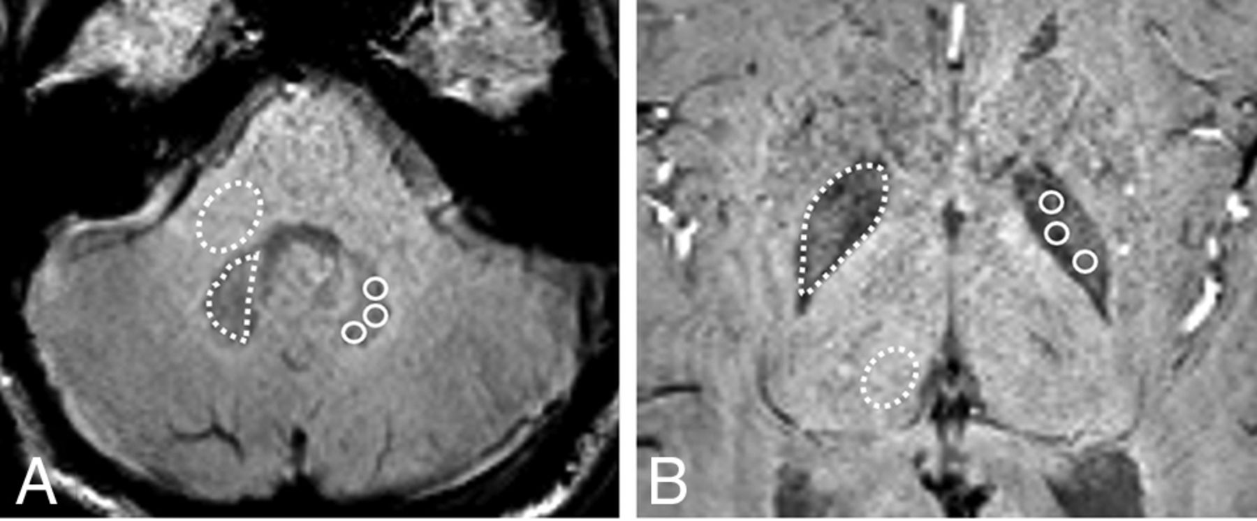 SWI at the level of the DN (A) and GP (B) used for drawing the ROIs in the DN and GP with the corresponding MCP and Th for normalization, respectively. Dotted lines illustrate the freehand ROI used to obtain SWImean from the DN, GP, MCP, and Th; solid lines illustrate the circular ROIs used to obtain SWImin from the DN and GP.