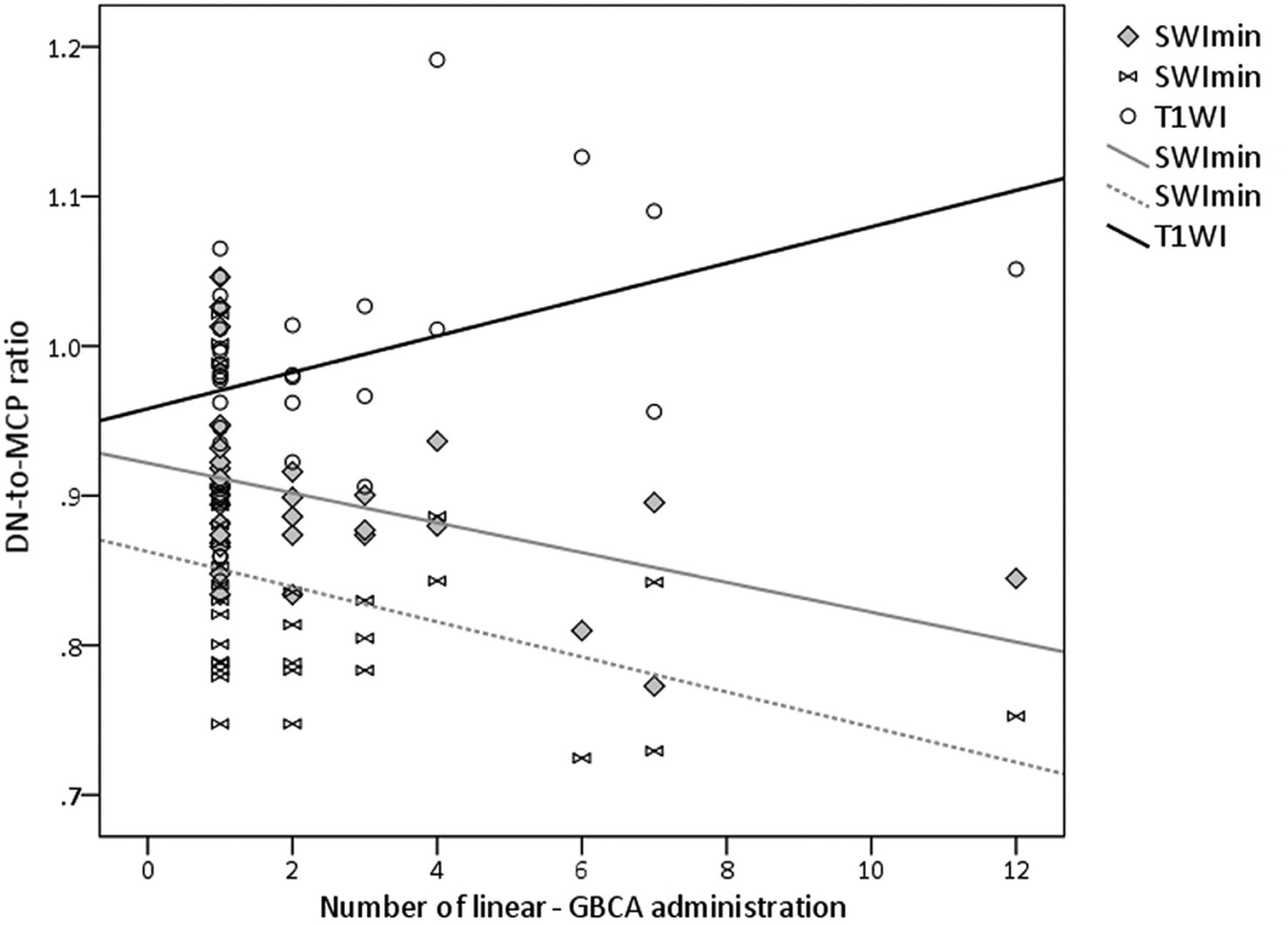 Scatterplot of the DN-to-MCP ratios for SWImean, SWImin, and T1WI versus the number of intravenous linear GBCA administrations, with linear regression lines for each group.