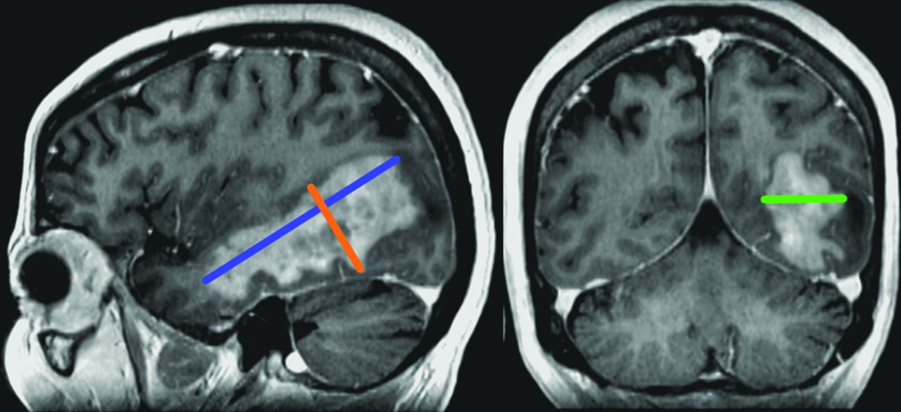 Since the first international guidelines were published in 1981 by the World Health Organization,1 there are currently 2 main coexisting paradigms for clinically assessing tumor responses to treatments. On the one hand, there are unidimensional criteria, mainly represented by the Response Evaluation Criteria in Solid Tumor (RECIST). These criteria are widely accepted for the assessment of nonneurologic tumors. On the other hand, bidimensional criteria are mainly used for assessing primary cerebral tumors, such as the modified Macdonald criteria and the Response Assessment in Neuro-Oncology Criteria for primary CNS tumors.2⇓-4 The unidimensional criteria are characterized by partial response (PR), defined as a 30% decrease in size, and progressive disease (PD), defined as a 20% increase in size. The bidimensional criteria are slightly different, with PR defined as a 50% decrease in size and PD corresponding to a 25% increase. The currently accepted guidelines for assessing primary central nervous system lymphomas (PCNSLs) indicate that unidimensional or bidimensional criteria may both be used indiscriminately.5 Most interesting, the recommended response criteria proposed by the authors were identical, notwithstanding the chosen measurement technique, ie, a 50% decrease in size to define PR and a 25% increase in size to define PD for both unidimensional and bidimensional measurements.