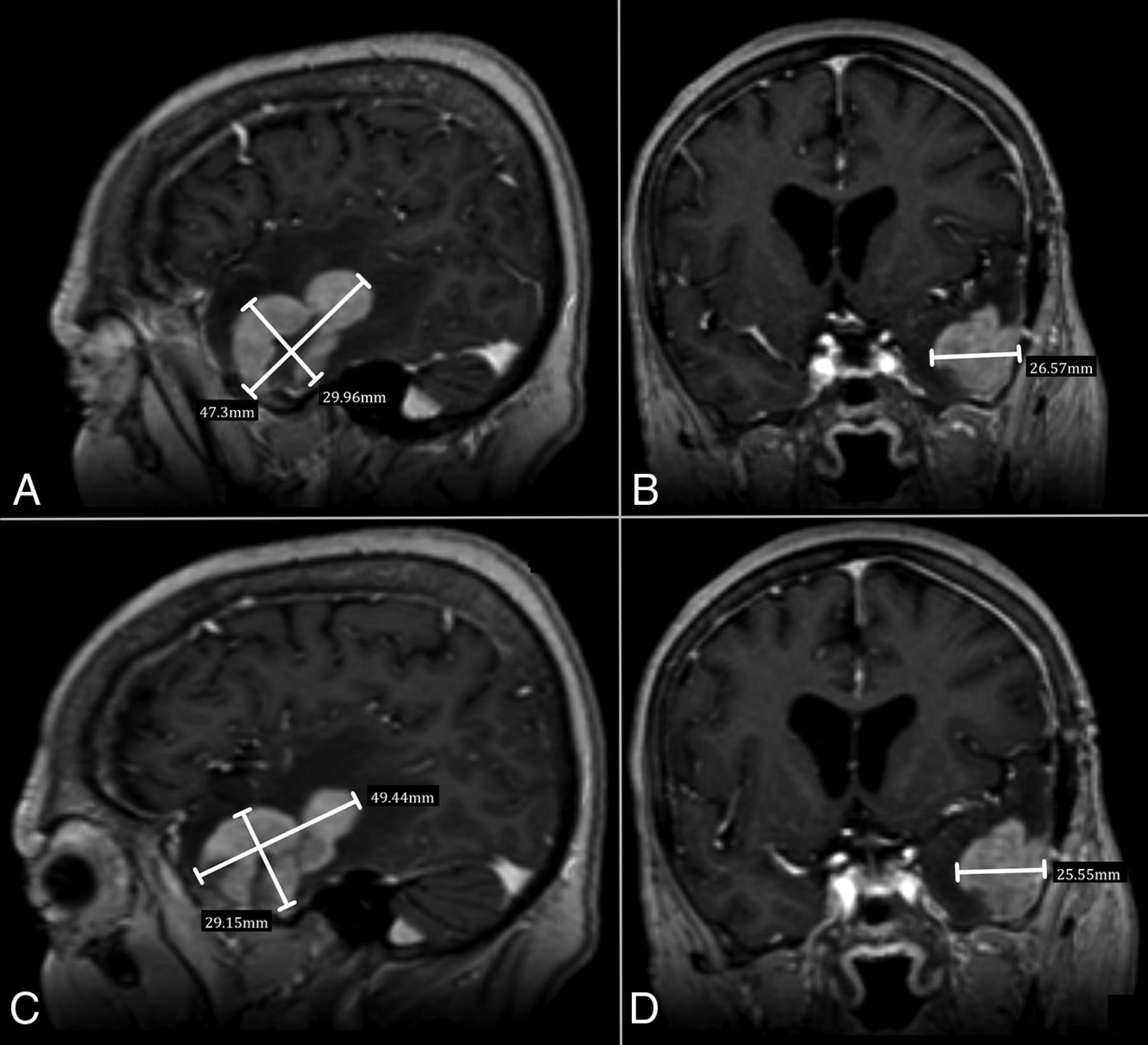 Postcontrast 3D T1 MPRAGE in a 56-year-old woman treated for a left temporal PCNSL. Comparison of the 3D measurements performed by the 2 readers (reader 1, A and B; reader 2, C and D).