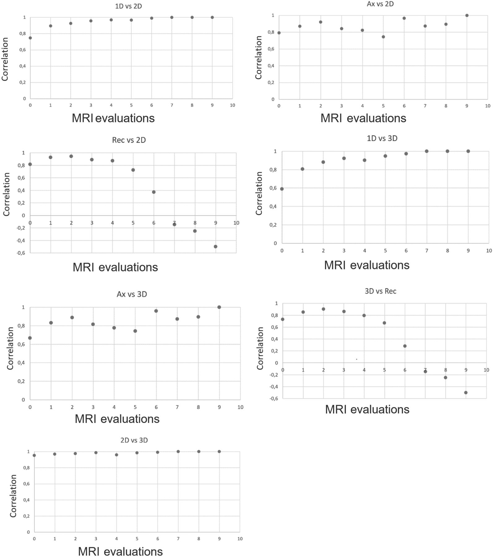To assess the response categorization, we calculated the variation in size on follow-up MR images in comparison with the baseline MR image. The correlation coefficients among the different techniques were obtained after applying a cubic root on volumetric measurements and a square root on surface areas. These data were evaluated in pairs with the Spearman rank correlation (axial 1D versus longest 1D, axial 1D versus 2D, and so forth).