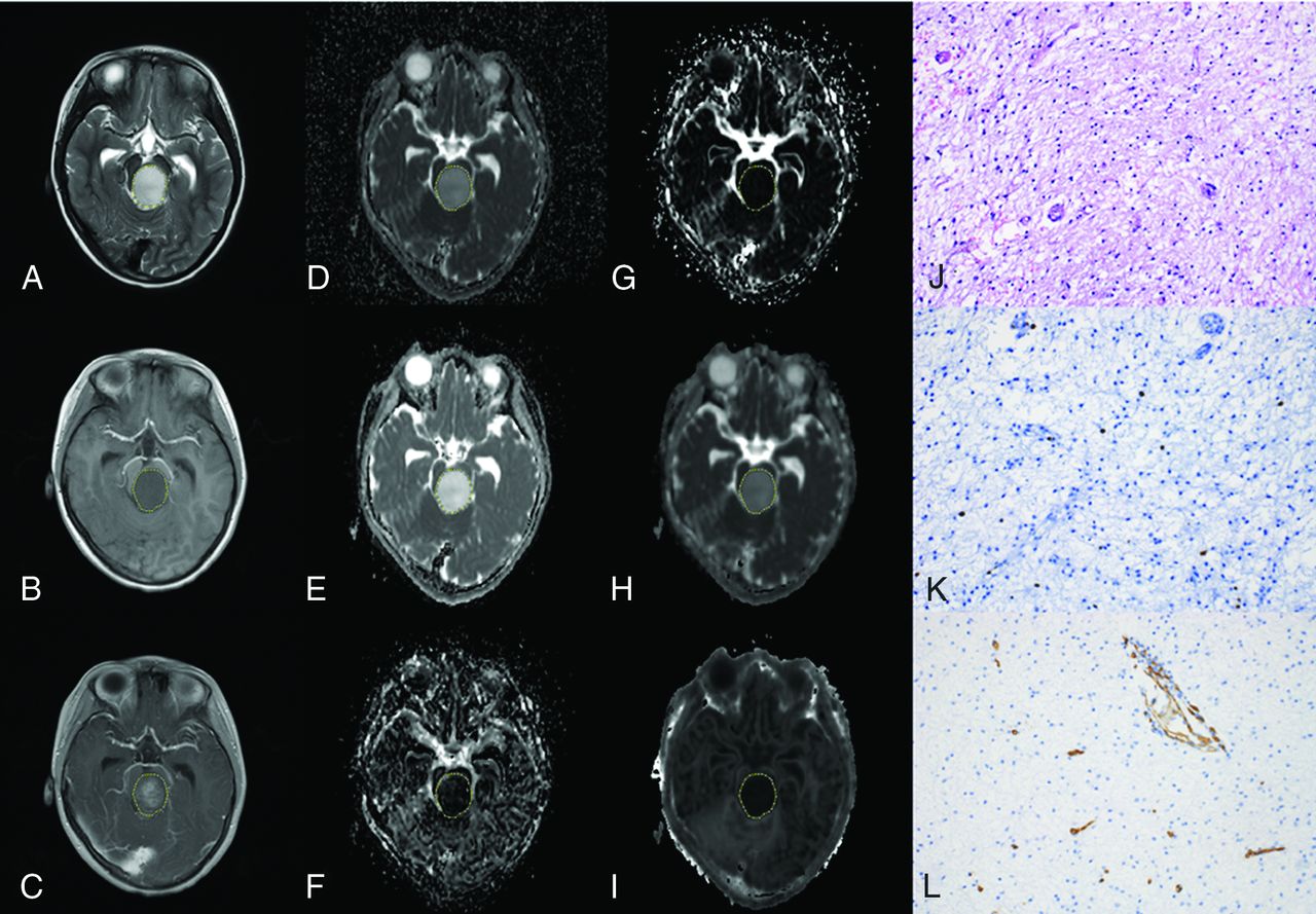 A 5-year-old boy with a diffuse astrocytoma in the brain stem (WHO grade II). The lesion shows hyperintensity on the T2-weighted image (A), hypointensity on the T1-weighted image (B), and enhancement on the postcontrast T1-weighted image (C). The lesion (VOI) demonstrates hyperintensity on the ADC map (D), D map (E), and Dk map (H) and hypointensity on the D* map (F), f map (G), and K map (I), with values of 1.528× 10−3mm2/s, 1.530 × 10−3 mm2/s, 1.681 × 10−3 mm2/s, 57.310 × 10−3 mm2/s, 2.394%, and 0.315, respectively. The pathologic diagnosis was diffuse astrocytoma with a cellularity of 1917 cell/mm2 (J), a Ki-67 index of 1.1% (K), and an MVD of 0.9% (L) (magnification, × 200).