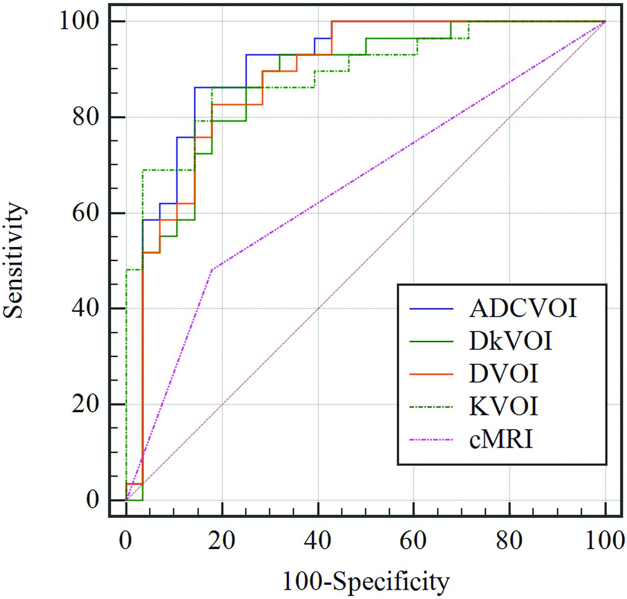 Receiver operating characteristic curves for ADCVOI, DVOI, DkVOI, KVOI, and conventional MR imaging in distinguishing low- from high-grade pediatric intracranial tumors.