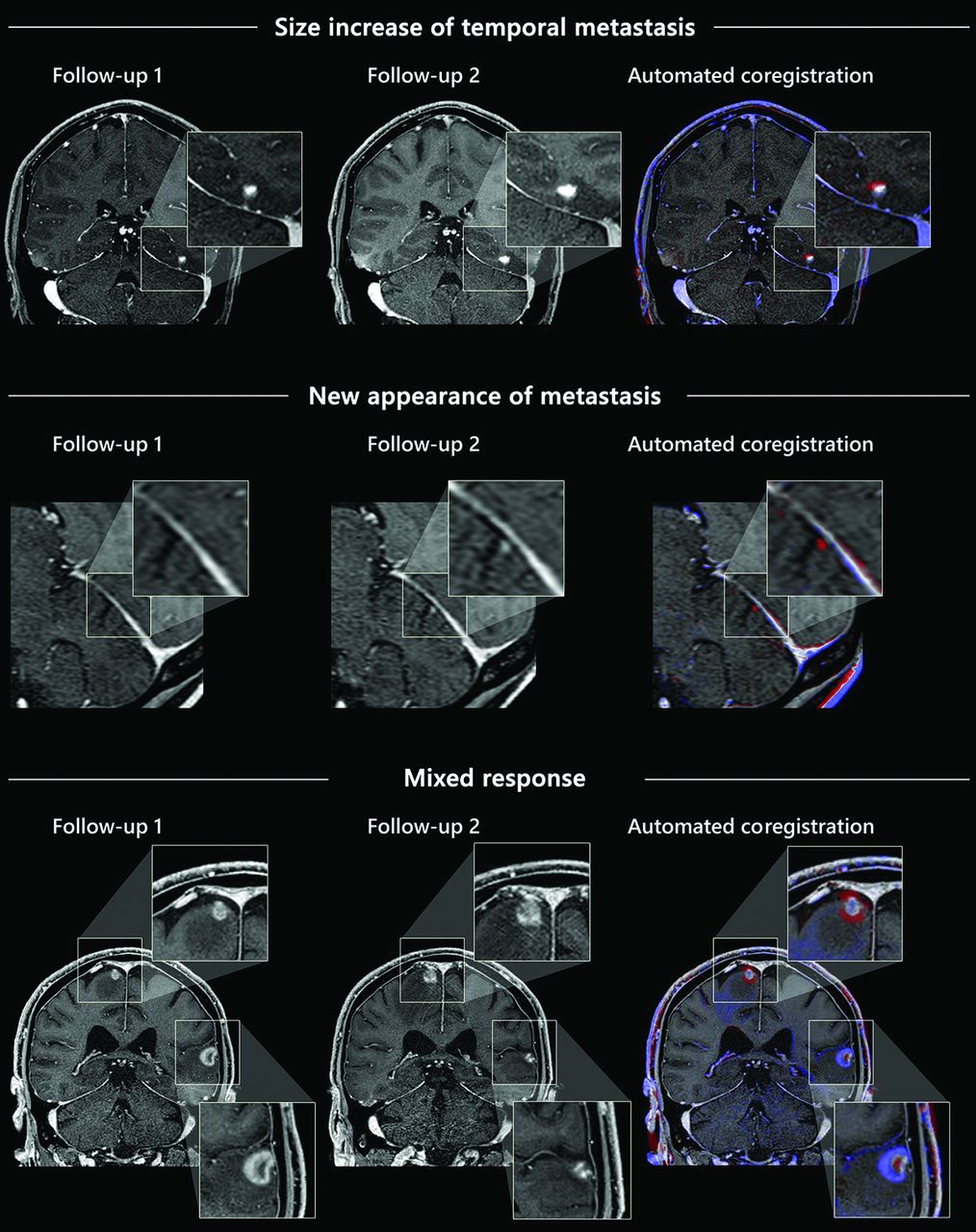 Examples of the automated coregistration of follow-up examinations and color-coding of longitudinal changes in contrast-enhanced, T1-weighted 3D sequences.