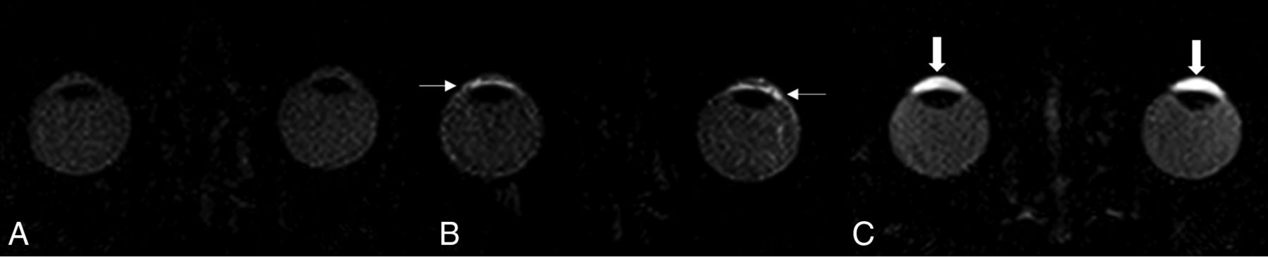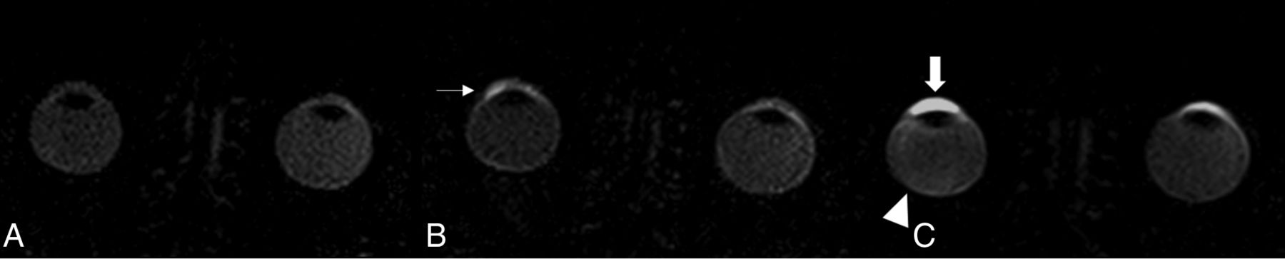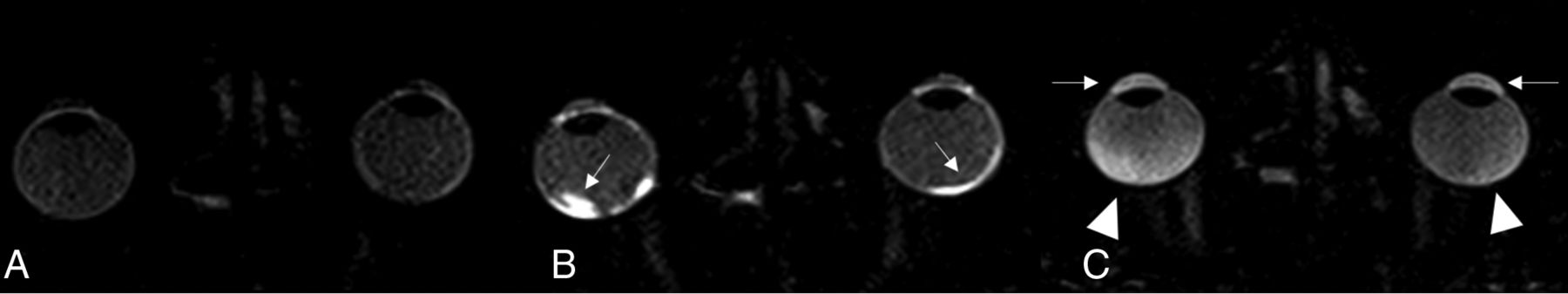 Image demonstrating contrast agent kinetics after injection of gadolinium in healthy patients: native scan (A), scan 20 minutes after Gd injection demonstrating the physiologic permeability of Gd in the lateral eye chamber (small arrow) (B), and physiologic, symmetric enhancement in the central eye chamber and the VB in the late scan after 120 minutes (C) (thick arrows).