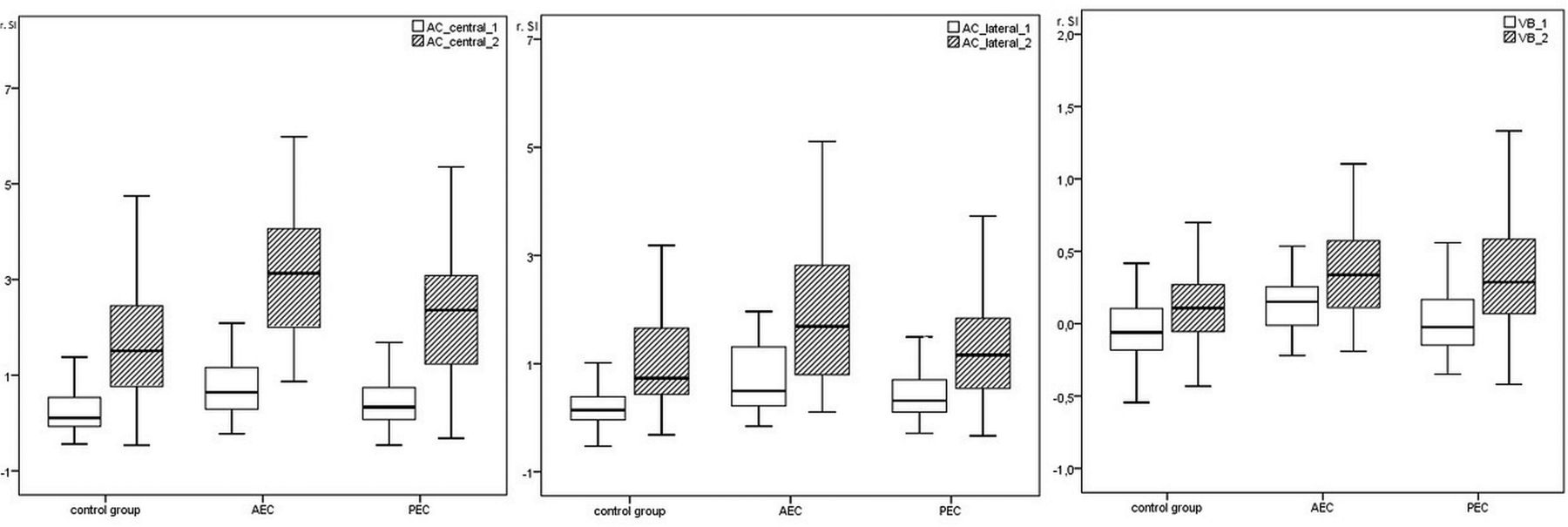 Relative SI 20 minutes (white boxplot) and 120 minutes (gray boxplot) after contrast application in the AC central (AC_central_1 = 20 minutes, AC_central_2 = 120 minutes), AC lateral (AC_lateral_1 = 20 minutes, AC_lateral = 120 minutes), and VB (VB_1 = 20 minutes, VB_2 = 120 minutes) in the control group and in patients with disorders in the AECs and PECs.