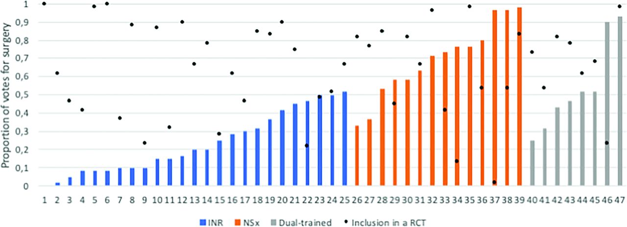 Proportions of votes for surgical management and inclusion in an RCTs (black dots) for each rater and rater’s background. INR indicates interventional neuroradiologists; NSx, neurosurgeons.