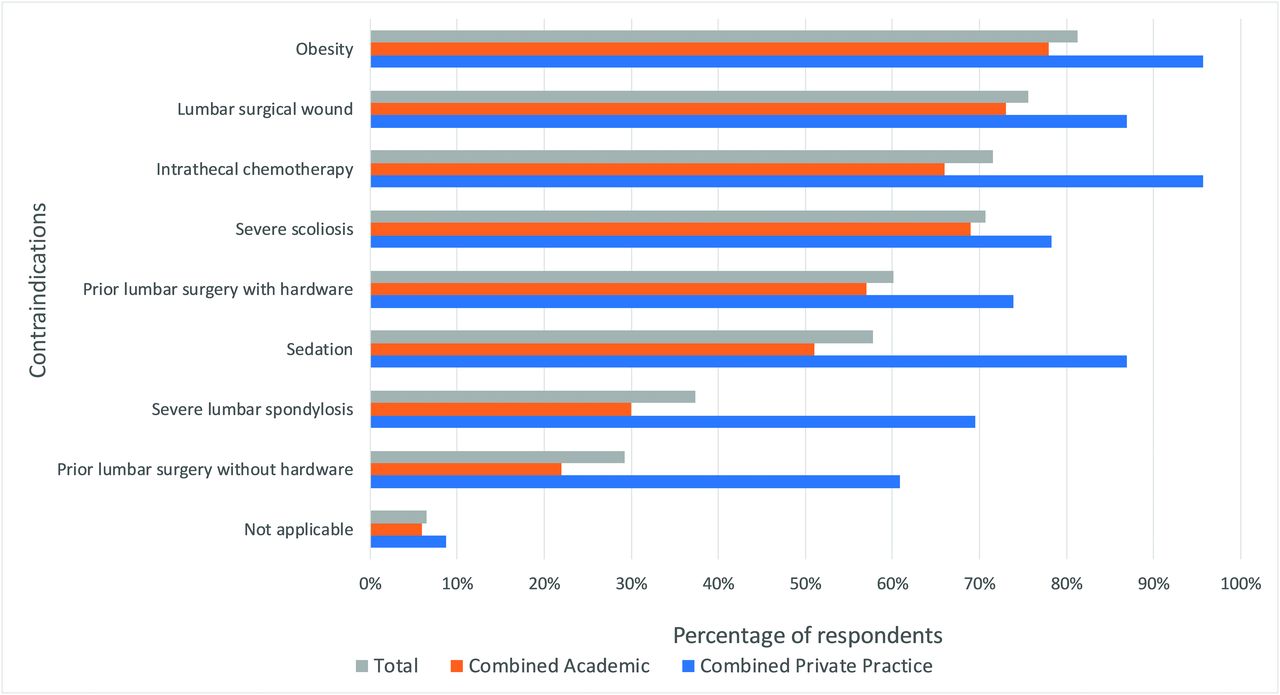 Compared with private practice, respondents from an academic type of practice were 5.99 times (95% CI, 2.35–16.01 times) more likely to require a bedside LP attempt before an FGLP. In practices in which neither physician extenders nor trainees performed FGLPs, only 25% required a bedside attempt. When asked about possible reasons that a patient could skip undergoing a bedside LP and go directly to FGLP, the 2 most common reasons were morbid obesity in which the bony landmarks (81.3%) cannot be palpated and surgical wound or infection limiting access (75.6%). Figure 3 shows additional responses.