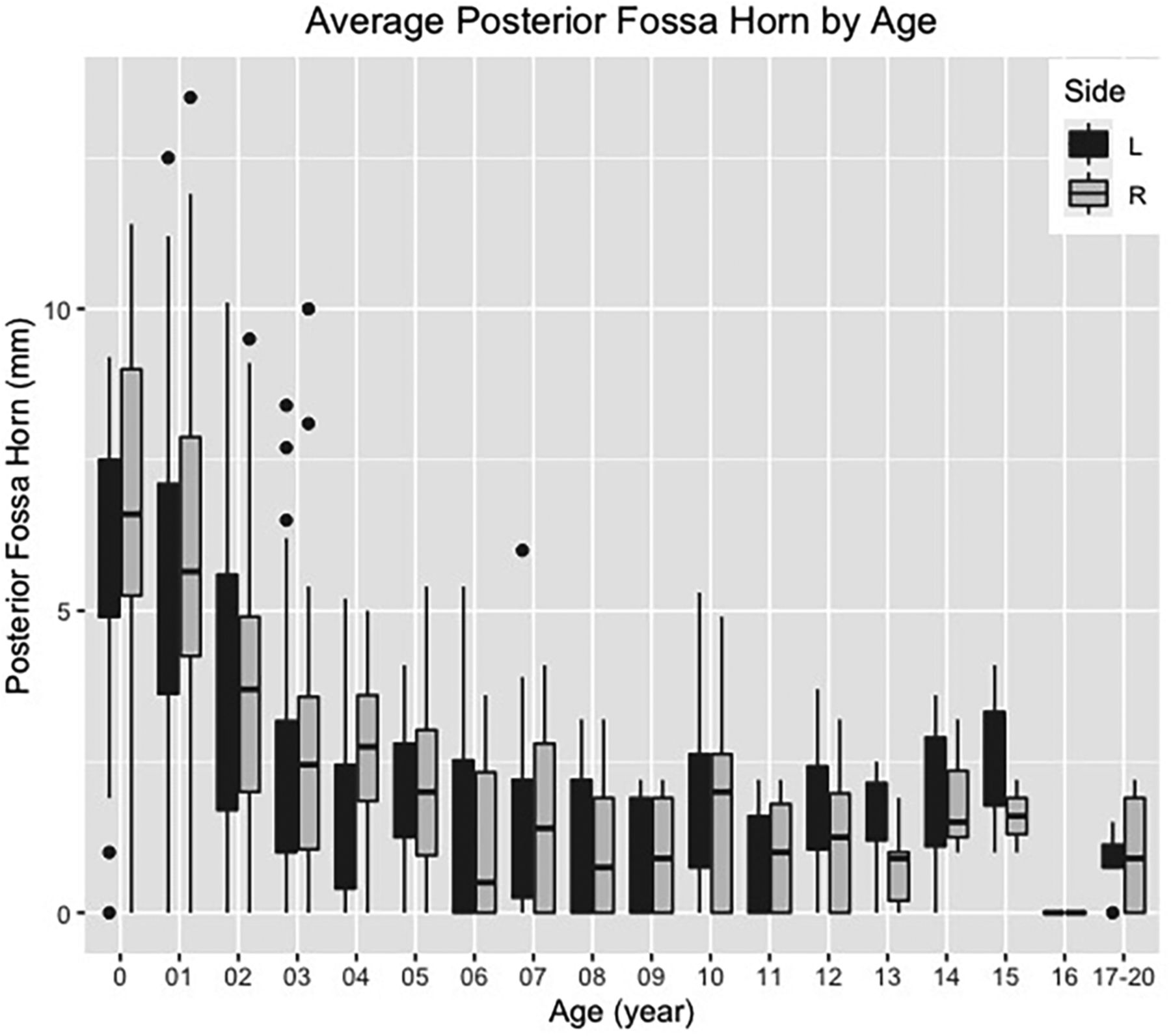 Average left and right posterior fossa horns by age. R indicates right; L, left.