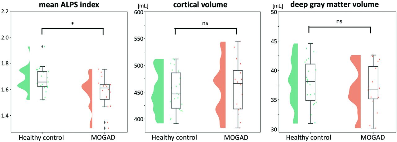 RESULTS: The mean ALPS index of patients with MOGAD was significantly lower than that of healthy controls (Cohen d = 0.93, false discovery rate–corrected P = .02). The lower mean ALPS index was significantly associated with a worse Expanded Disability Status Scale score (Spearman ρ = −0.51; 95% CI, −0.85 to −0.02; P = .03). However, cortical volume and deep gray matter volume were not significantly different between the 2 groups, and they were not correlated with the Expanded Disability Status Scale.