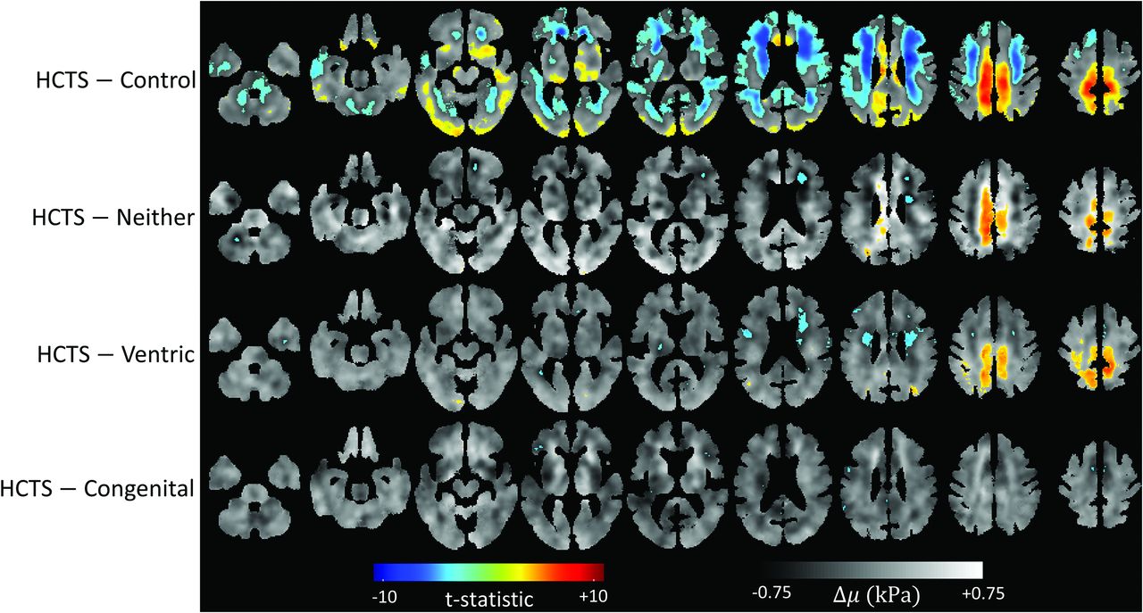 Stiffness difference maps. FDR thresholded (Q < 0.05) t-statistic maps overlayed on voxelwise calculated stiffness difference maps between each group and the HCTS group. The number of voxels crossing the FDR threshold was 735 in Congenital, 11,364 in Ventric, 6931 in Neither, and 93,254 in control.