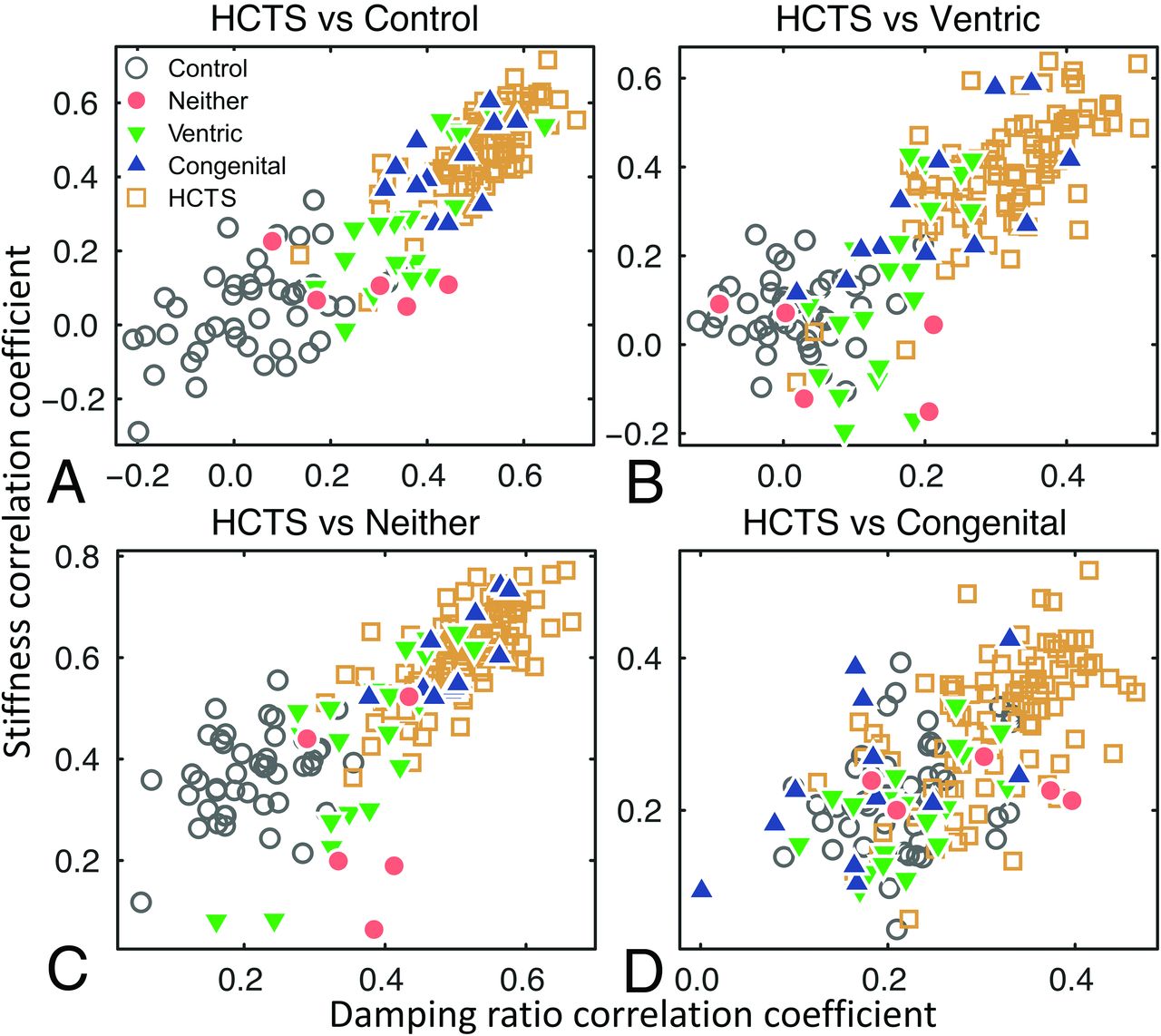 In Fig 6, scatterplots of damping ratio and stiffness pattern scores are shown for 4 different contrasts. In the HCTS versus control contrast (Fig 6A), HCTS and control cases form distinct clusters, demonstrating the separability of these groups based on pattern scores. The remaining NPH subgroup cases were distributed among these clusters with intermediate pattern scores. In the HCTS-versus-Ventric contrast (Fig 6B), Ventric and HCTS cases were further separated than mentioned above because the reference map in this contrast excluded the feature of ventriculomegaly. Figure 6C shows the pattern scores for HCTS-versus-Neither contrast, and Fig 6D shows the pattern scores for HCTS-versus-Congenital contrast. The reference features extracted in these latter contrasts are labeled in Fig 1B. The scatterplots for the remaining 6 contrasts are included in the Online Supplemental Data.