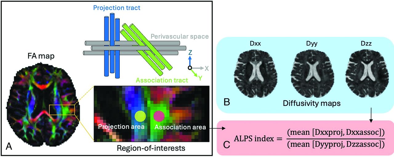 The average values of left and right ALPS indices were evaluated. An ALPS index closest to 1 reflects minimal diffusion along the perivascular space, whereas a larger ratio indicates larger water diffusivity along the perivascular space.18