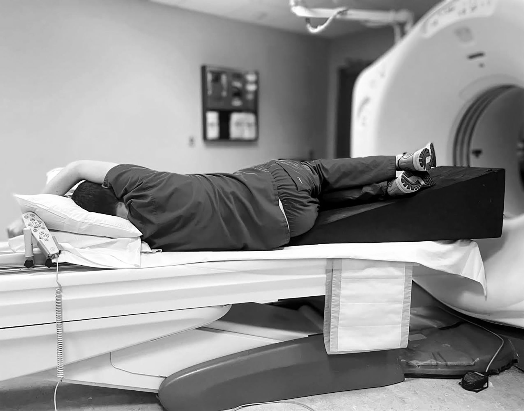 Illustration of the hips elevated with the assistance of a foam wedge, and the head elevated on pillows, allowing contrast to pool in the thoracic spine.