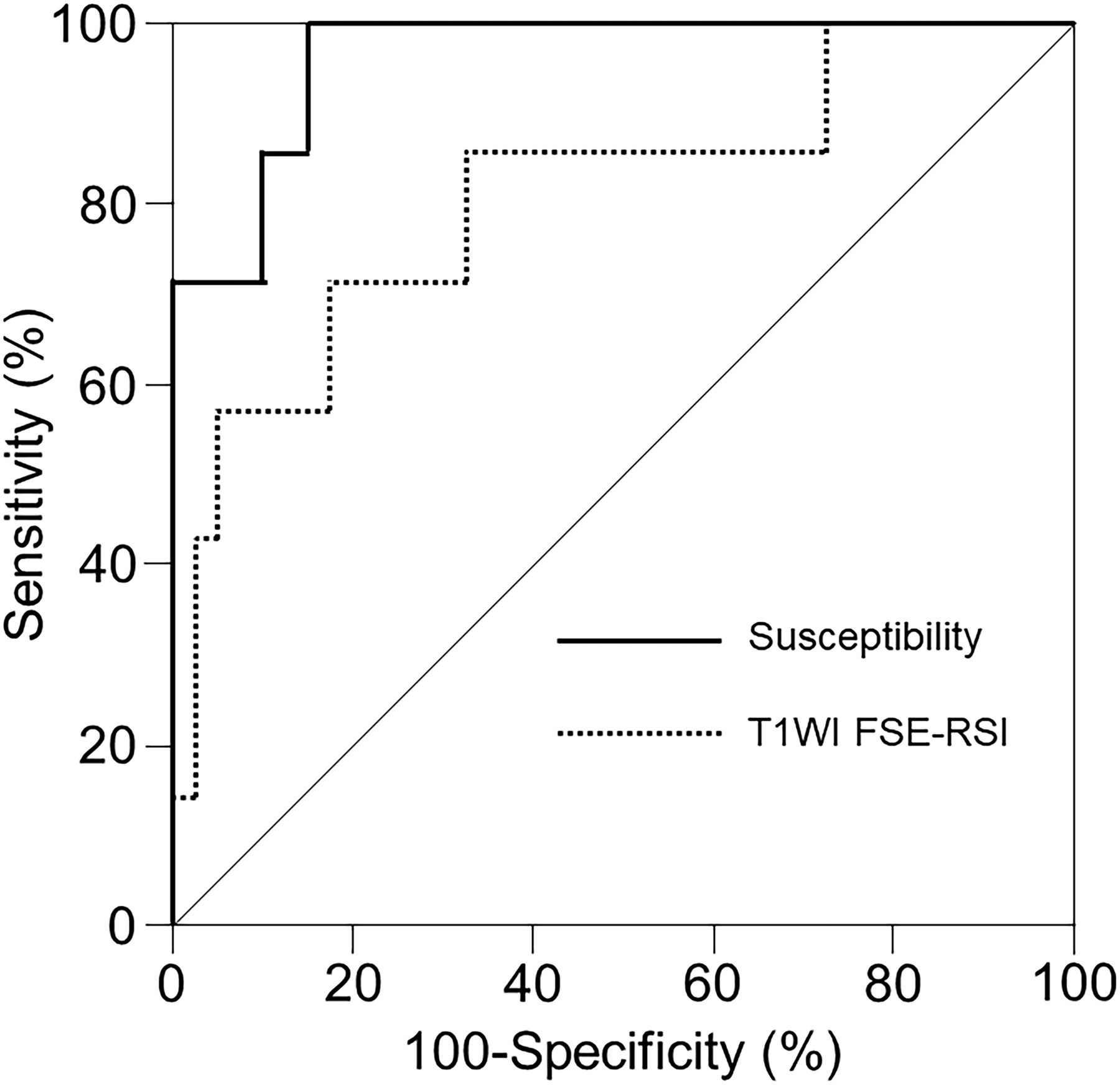 Sensitivity, specificity, and positive and negative predictive values for the cutoff point lying closest to the upper left corner of the ROC curve for the detection of histologic sections consisting primarily of IPH were 71%, 83%, 42%, and 94%, respectively, for T1-weighted FSE-RSI (cutoff, 1.90) and 100%, 85%, 54%, and 100%, respectively, for susceptibility (cutoff, 115.7 ppb). Marginal homogeneity was observed between histologic sections consisting primarily of IPH and susceptibility (P = .0412), but not between histologic sections consisting primarily of IPH and T1-weighted FSE-RSI (P = .1824).